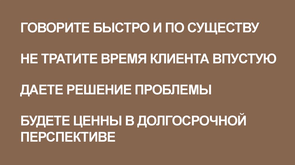 ГОВОРИТЕ БЫСТРО И ПО СУЩЕСТВУНЕ ТРАТИТЕ ВРЕМЯ КЛИЕНТА ВПУСТУЮ
