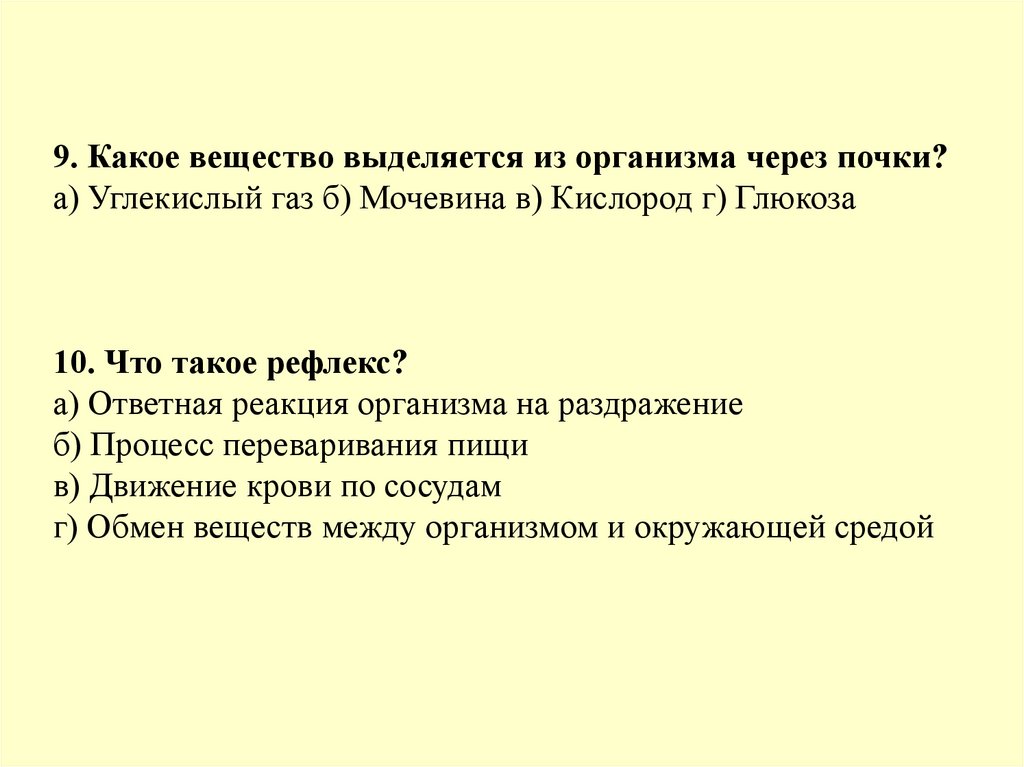 9. Какое вещество выделяется из организма через почки?а) Углекислый газ б) Мочевина в) Кислород г) Глюкоза