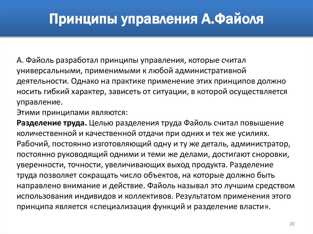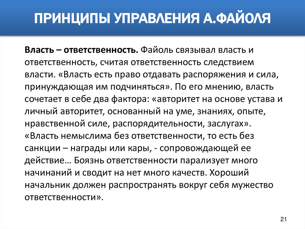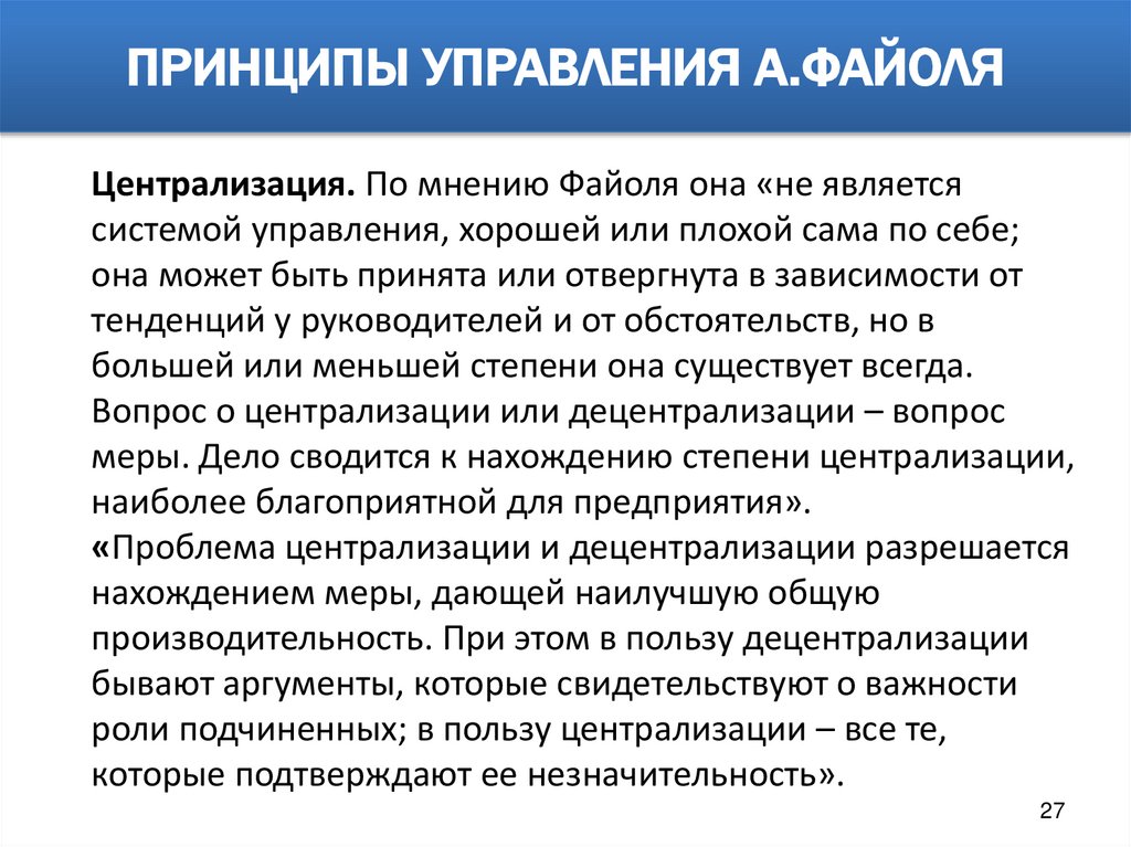 ПРИНЦИПЫ УПРАВЛЕНИЯ А.ФАЙОЛЯЦентрализация. По мнению Файоля она «не является