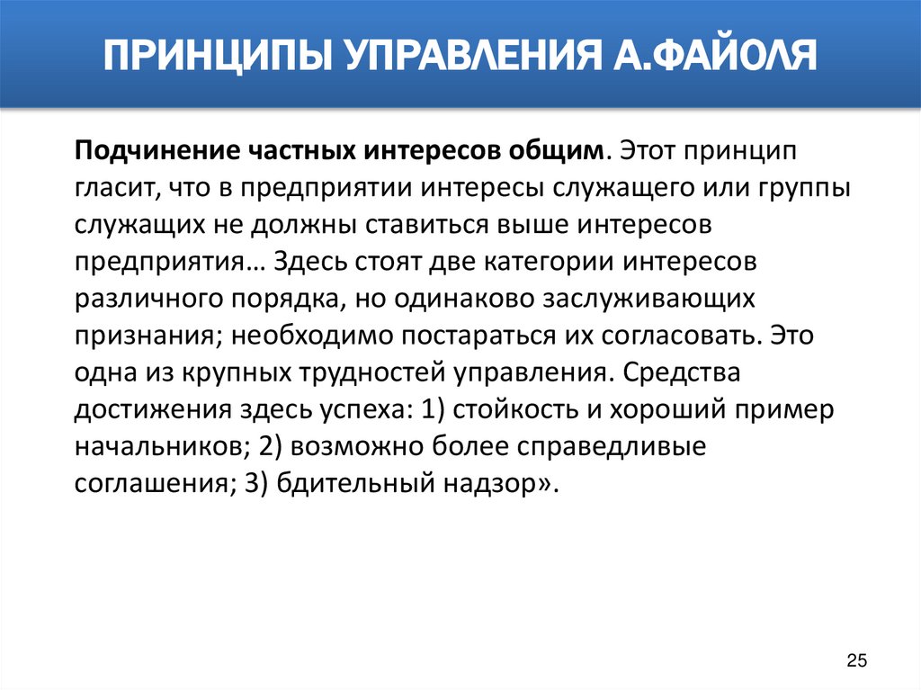 ПРИНЦИПЫ УПРАВЛЕНИЯ А.ФАЙОЛЯПодчинение частных интересов общим. Этот принцип