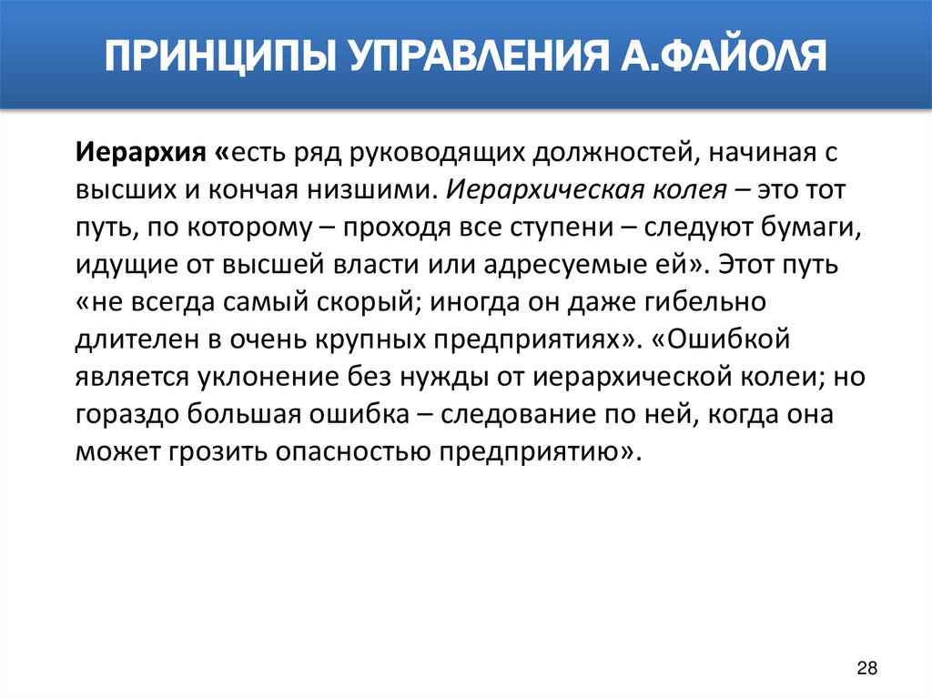 ПРИНЦИПЫ УПРАВЛЕНИЯ А.ФАЙОЛЯИерархия «есть ряд руководящих должностей, начиная с