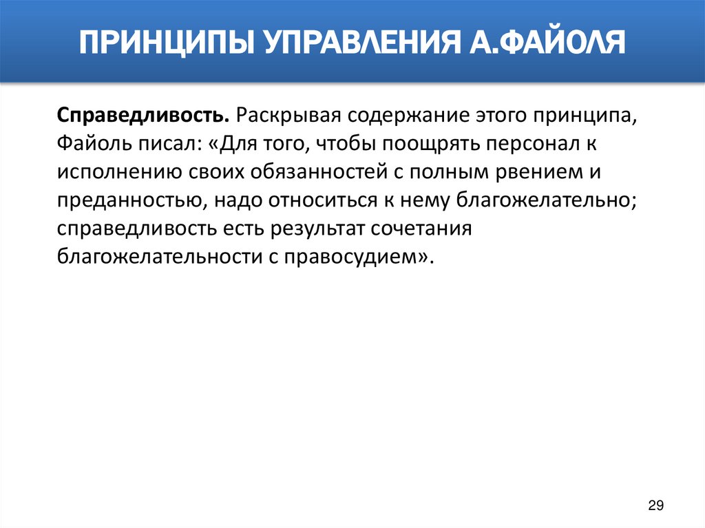 ПРИНЦИПЫ УПРАВЛЕНИЯ А.ФАЙОЛЯСправедливость. Раскрывая содержание этого принципа,