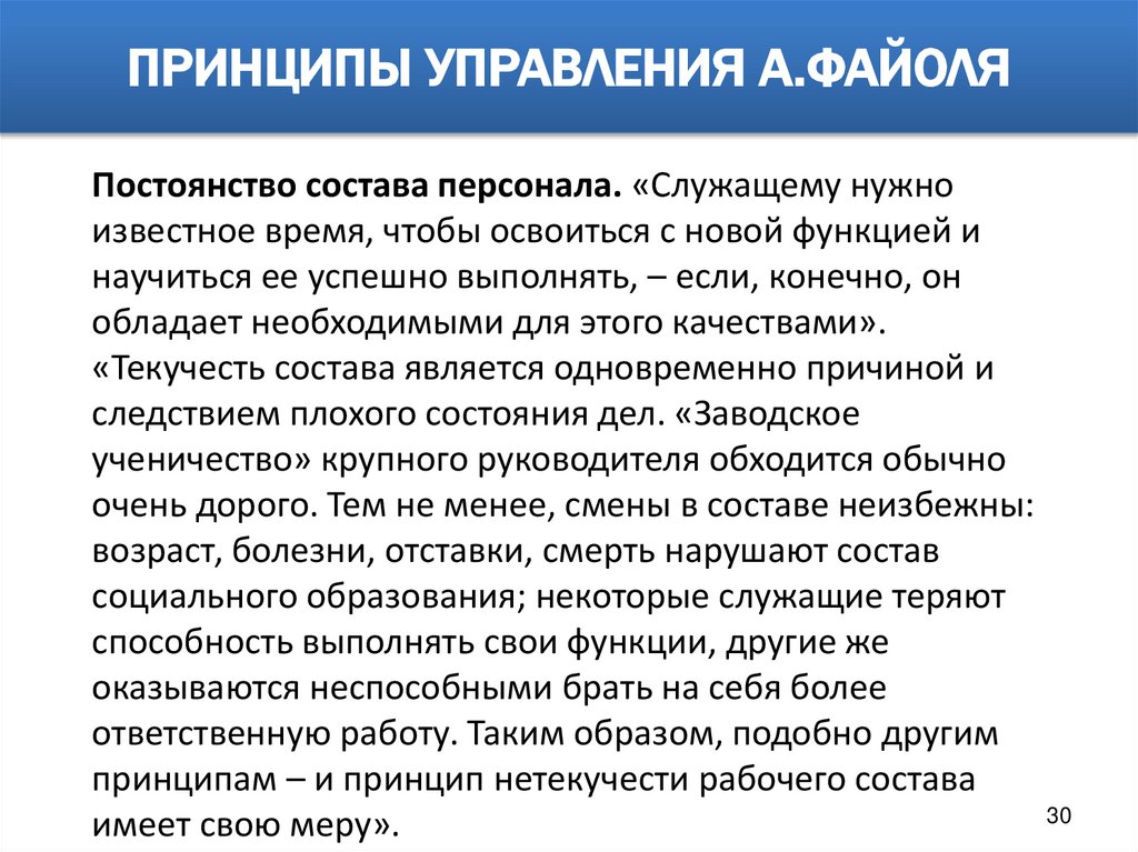 ПРИНЦИПЫ УПРАВЛЕНИЯ А.ФАЙОЛЯПостоянство состава персонала. «Служащему нужно