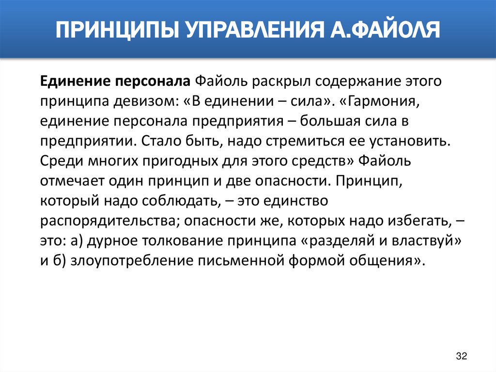 ПРИНЦИПЫ УПРАВЛЕНИЯ А.ФАЙОЛЯЕдинение персонала Файоль раскрыл содержание этого