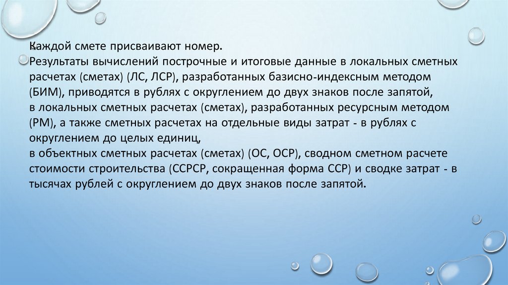 Каждой смете присваивают номер.Результаты вычислений построчные и итоговые данные в локальных сметных