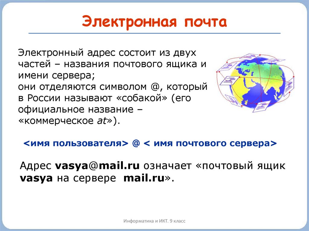 Адрес vasya@mail.ru означает «почтовый ящик