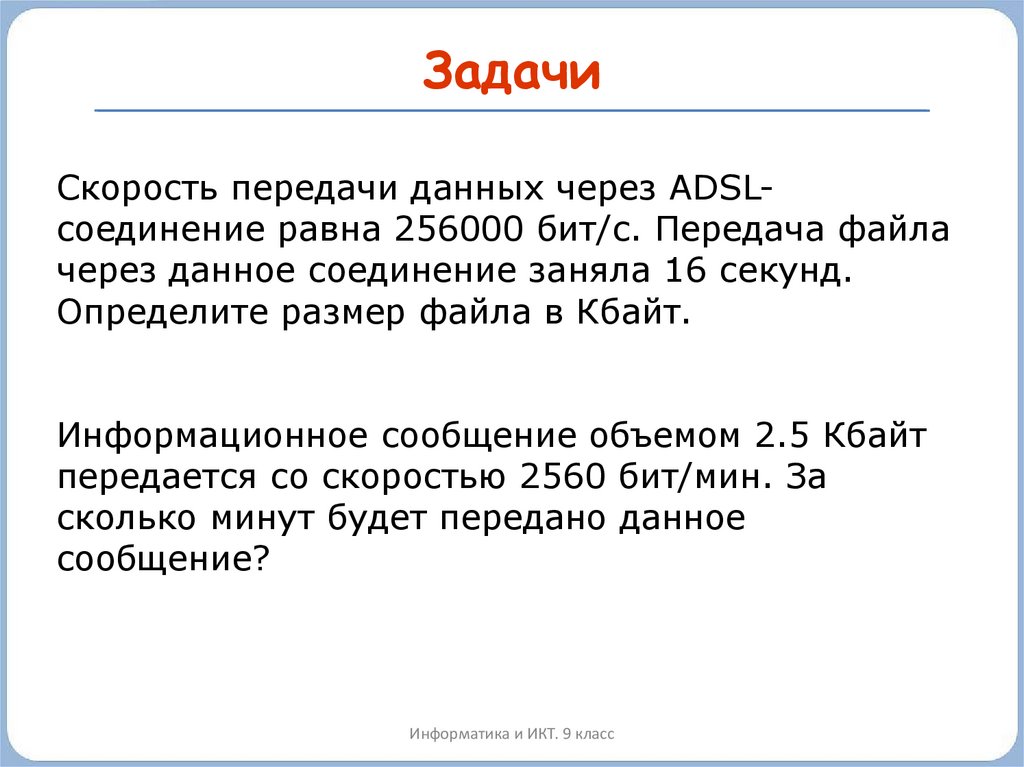 ЗадачиСкорость передачи данных через ADSLсоединение равна 256000 бит/c. Передача файла