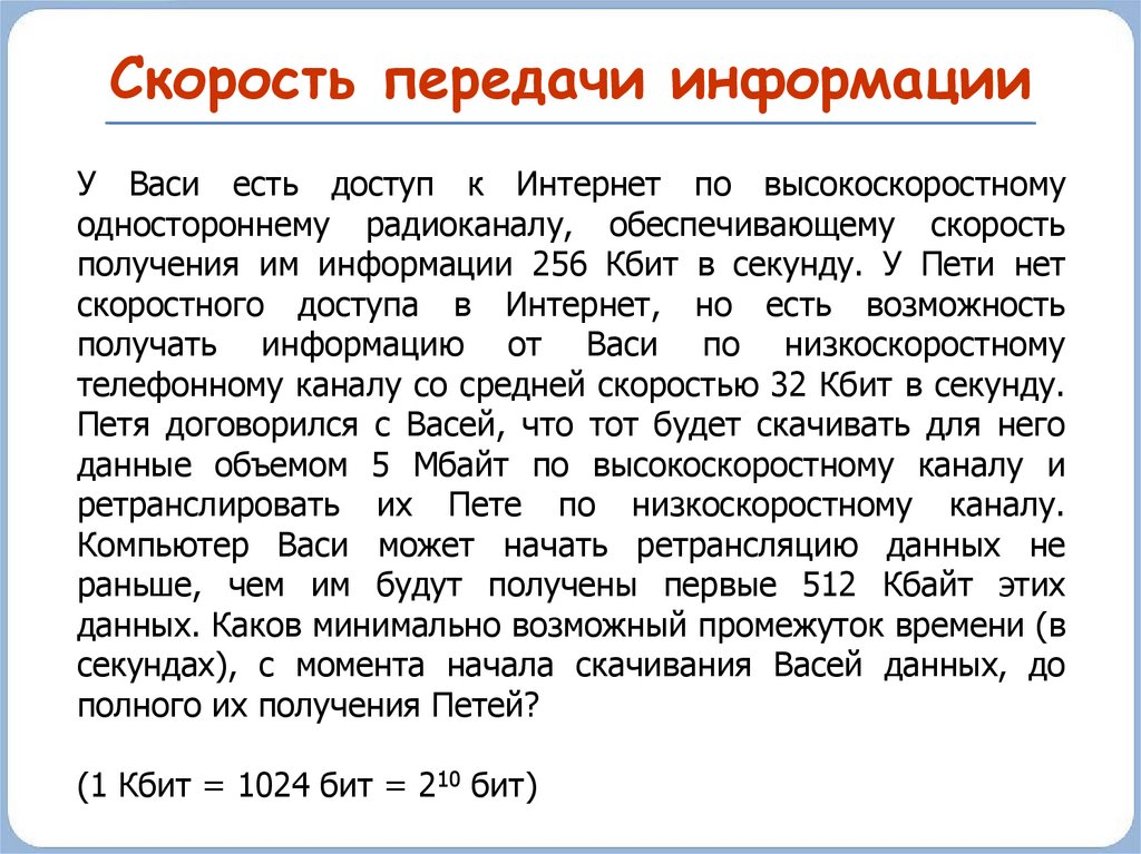 Скорость передачи информацииУ Васи есть доступ к Интернет по высокоскоростному