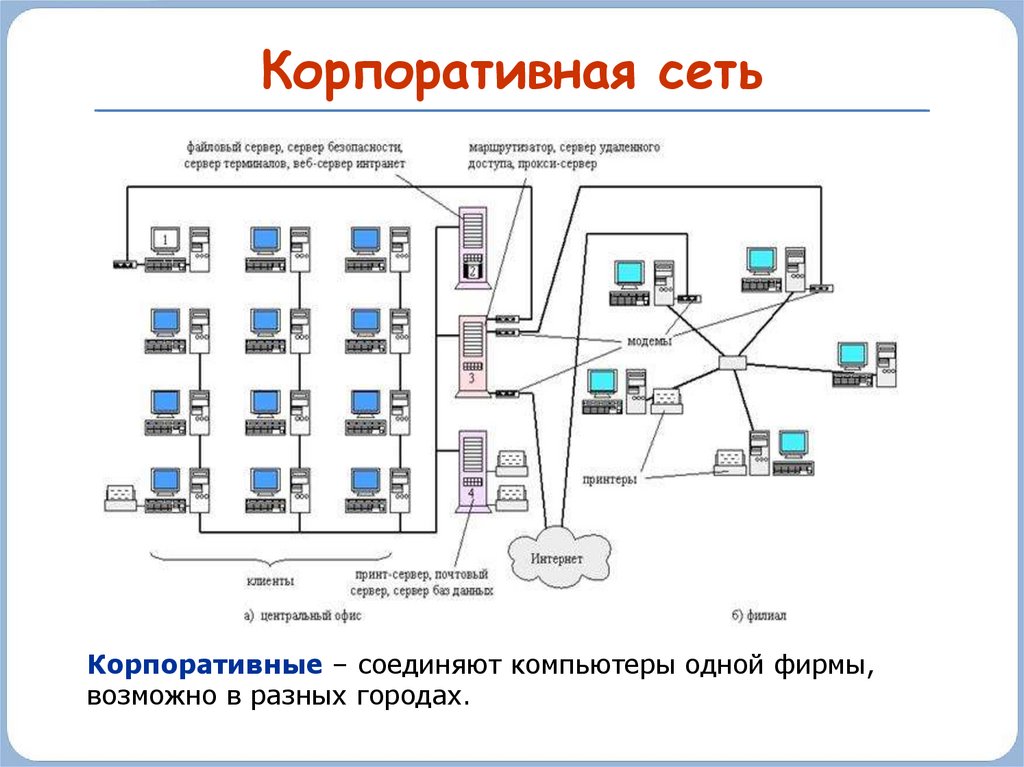 Корпоративная сетьКорпоративные – соединяют компьютеры одной фирмы,