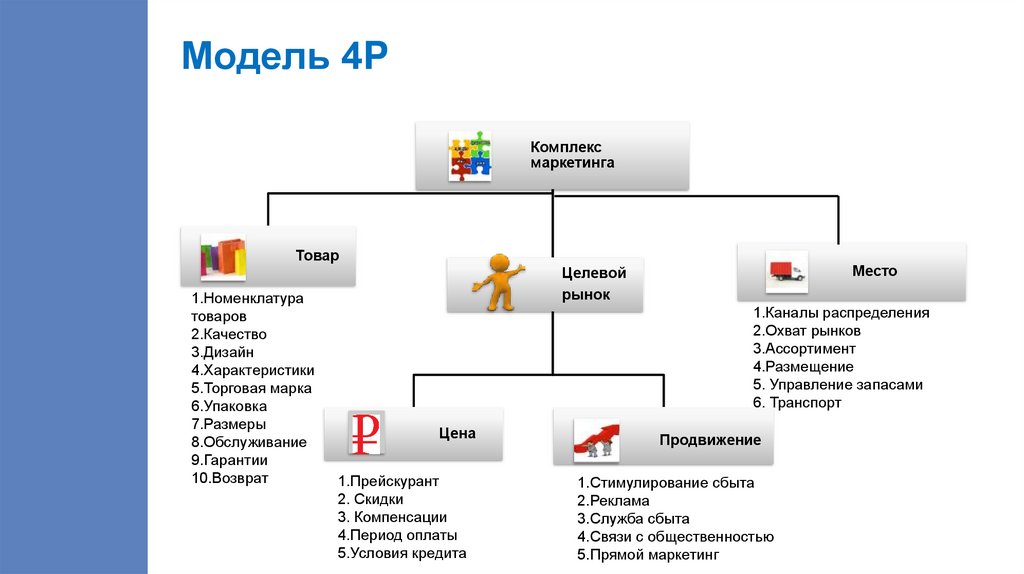 Комплекс маркетинга - совокупность управляемых параметров маркетинговойдеятельности, манипулируя которыми руководство организации старается