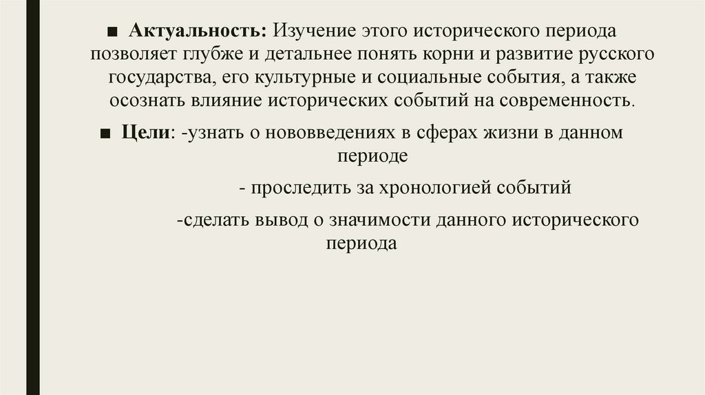 ■ Актуальность: Изучение этого исторического периодапозволяет глубже и детальнее понять корни и развитие русского