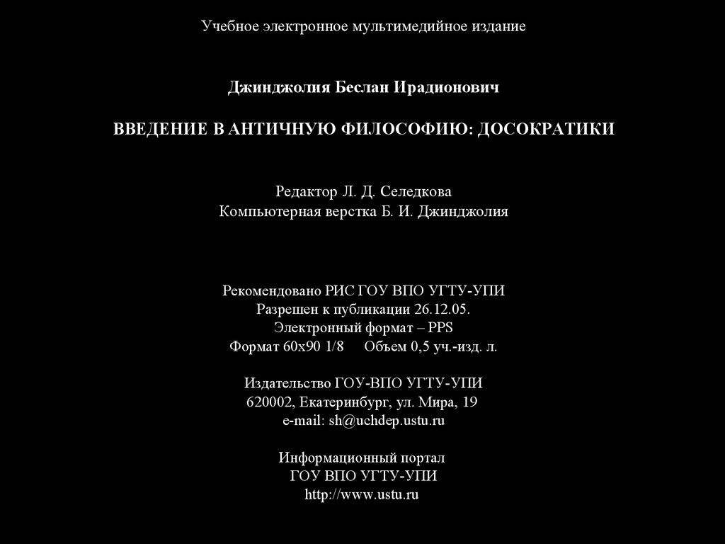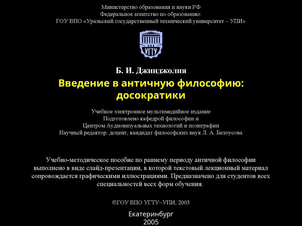 ВВЕДЕНИЕ В АНТИЧНУЮ ФИЛОСОФИЮ: ДОСОКРАТИКИ