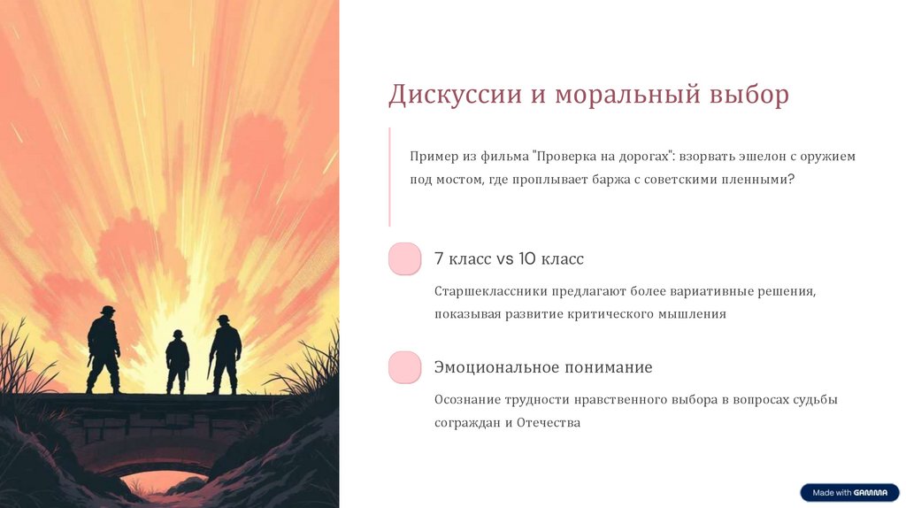 Дискуссии и моральный выборПример из фильма "Проверка на дорогах": взорвать эшелон с оружием