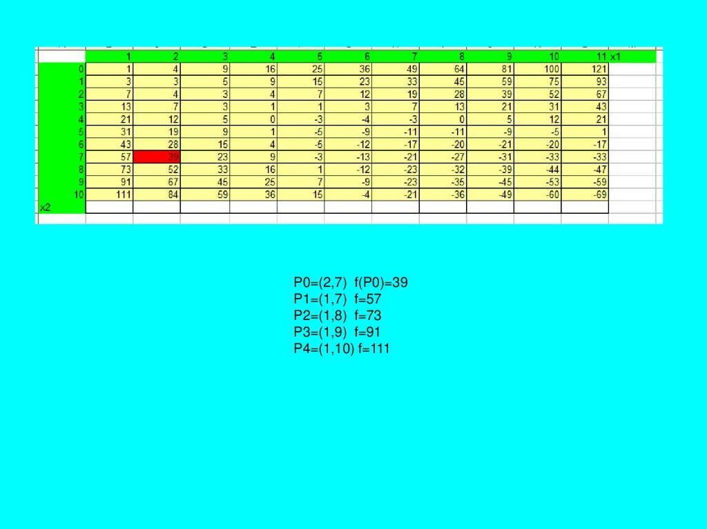 P0=(2,7) f(P0)=39P1=(1,7) f=57