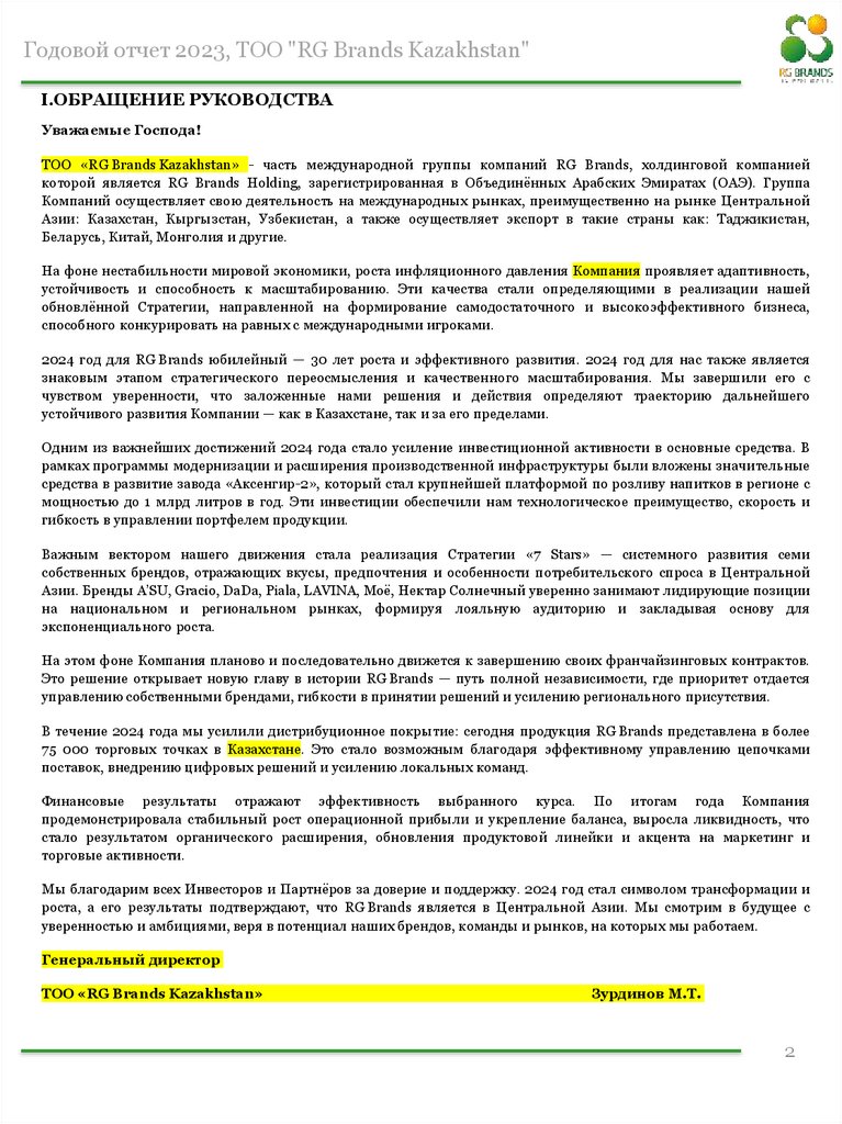 Годовой отчет 2023, ТОО "RG Brands Kazakhstan"I.ОБРАЩЕНИЕ РУКОВОДСТВА