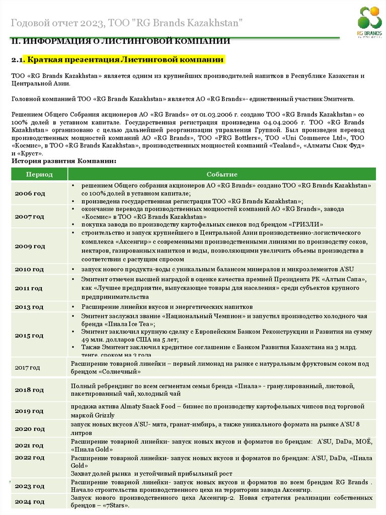 Годовой отчет 2023, ТОО "RG Brands Kazakhstan"II. ИНФОРМАЦИЯ О ЛИСТИНГОВОЙ КОМПАНИИ