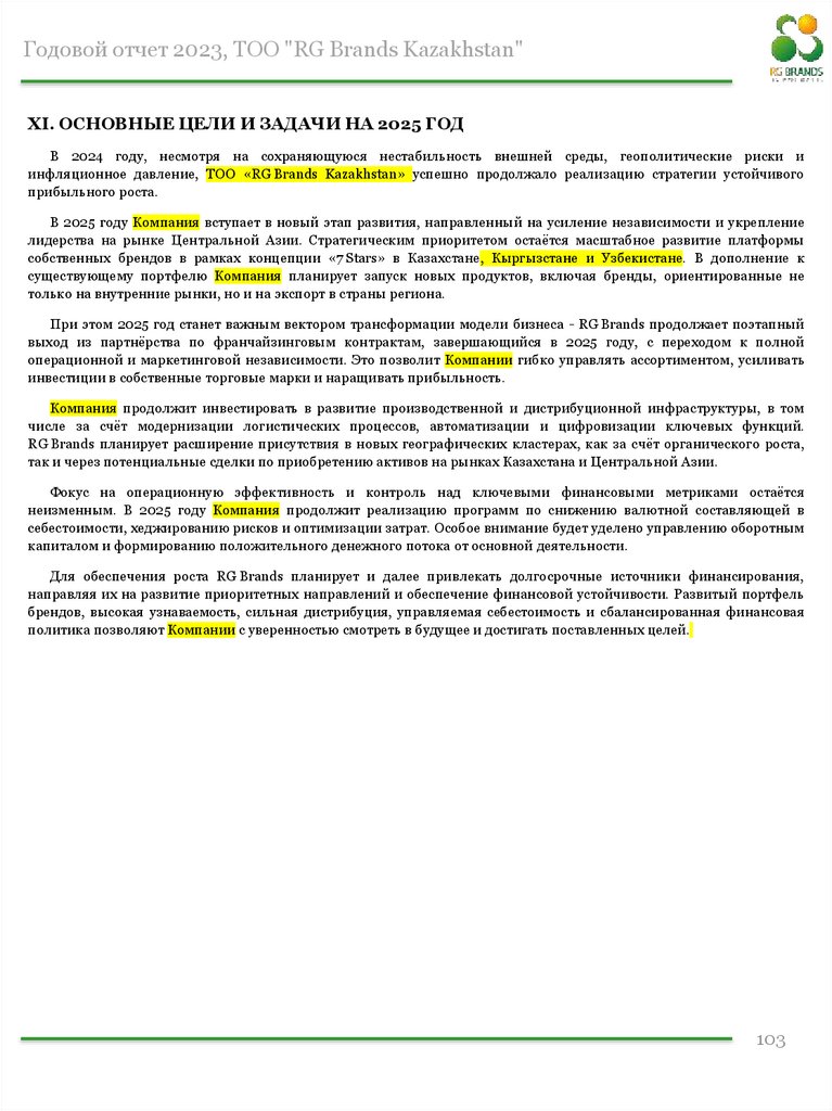 Годовой отчет 2023, ТОО "RG Brands Kazakhstan"XI. ОСНОВНЫЕ ЦЕЛИ И ЗАДАЧИ НА 2025 ГОД