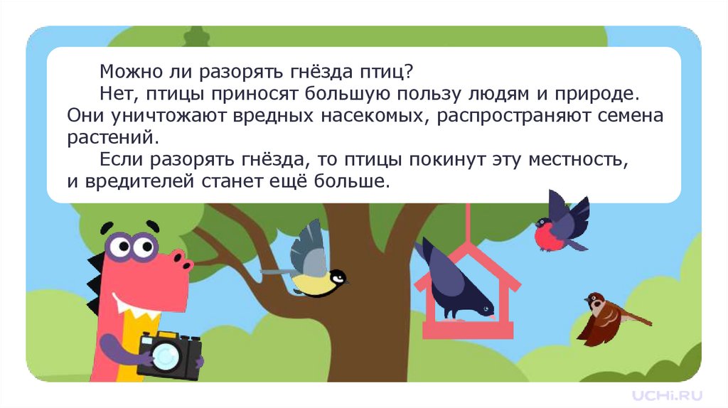 Можно ли разорять гнёзда птиц?Нет, птицы приносят большую пользу людям и природе.