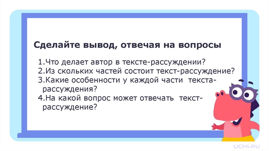 Сделайте вывод, отвечая на вопросы1.Что делает автор в тексте-рассуждении?