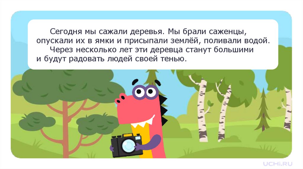 Сегодня мы сажали деревья. Мы брали саженцы,опускали их в ямки и присыпали землёй, поливали водой.