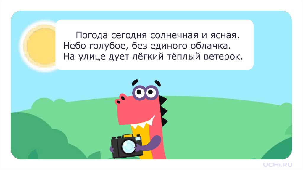 Погода сегодня солнечная и ясная.Небо голубое, без единого облачка.