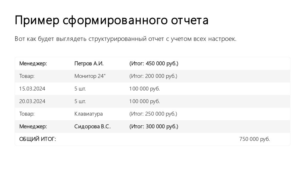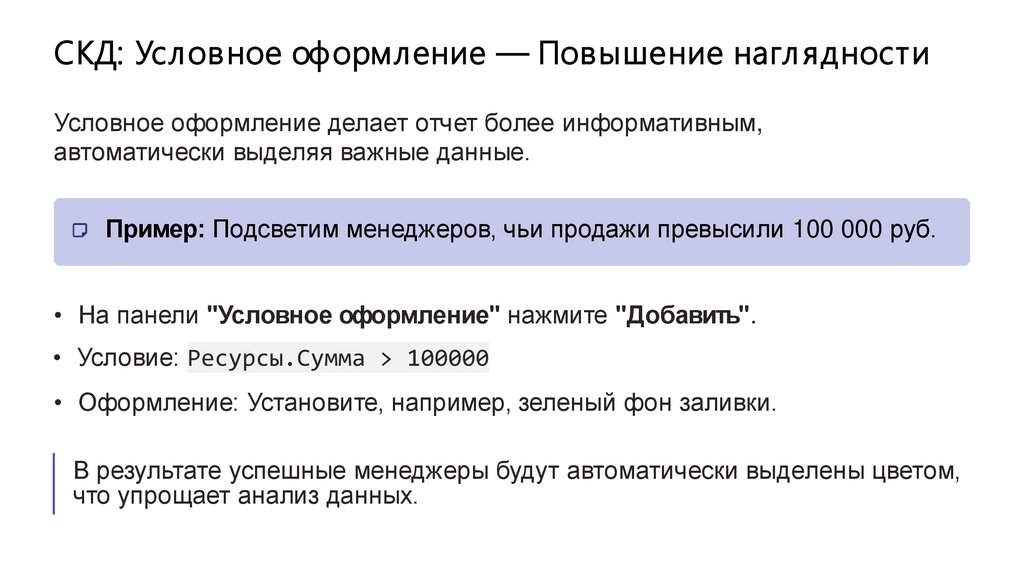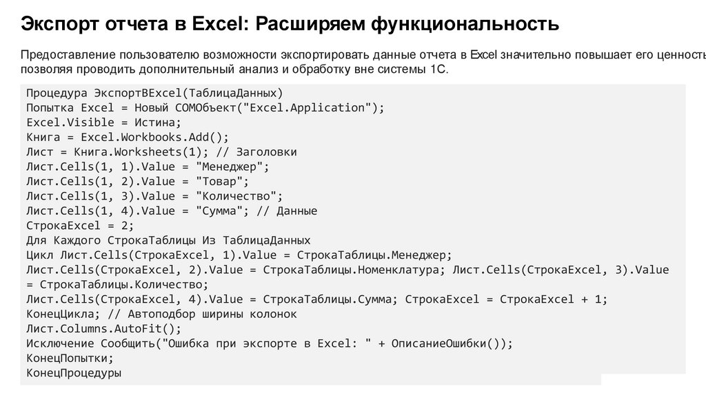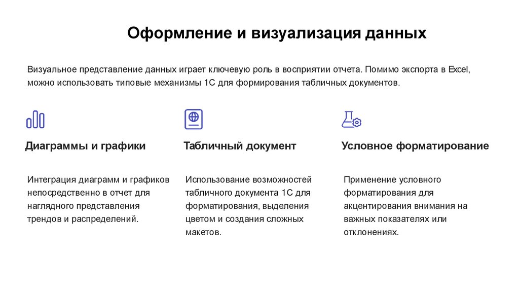 Оформление и визуализация данныхВизуальное представление данных играет ключевую роль в восприятии отчета. Помимо экспорта в Excel,
