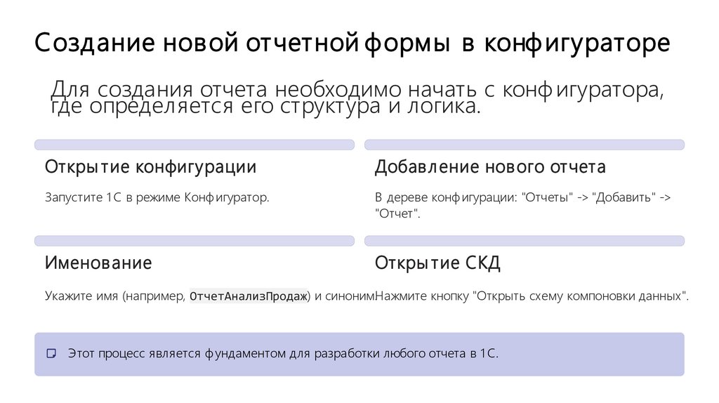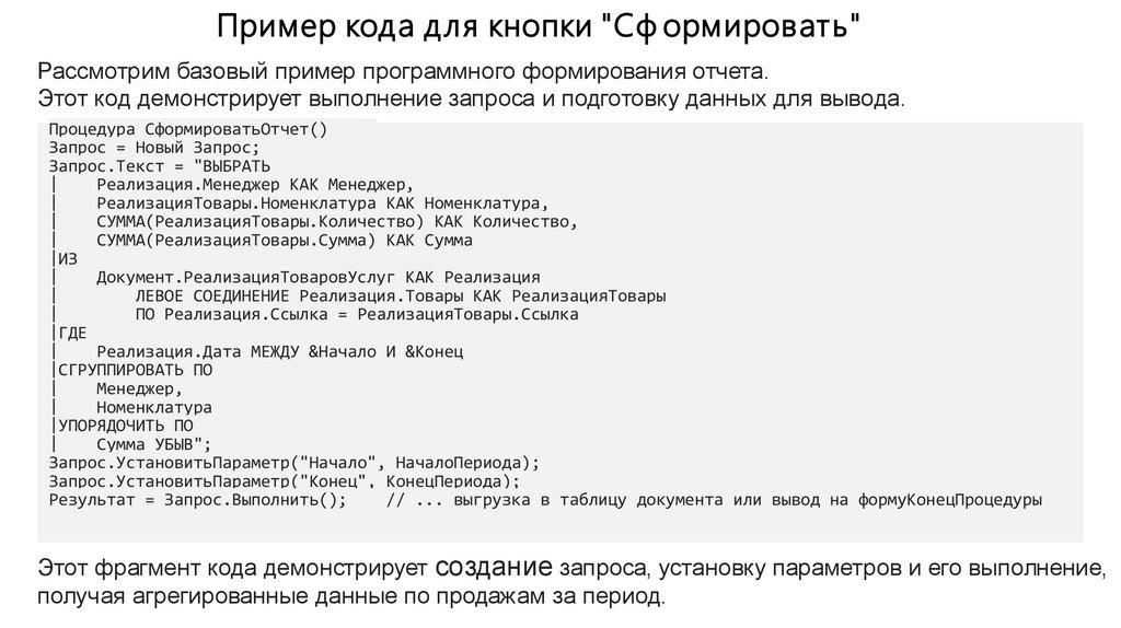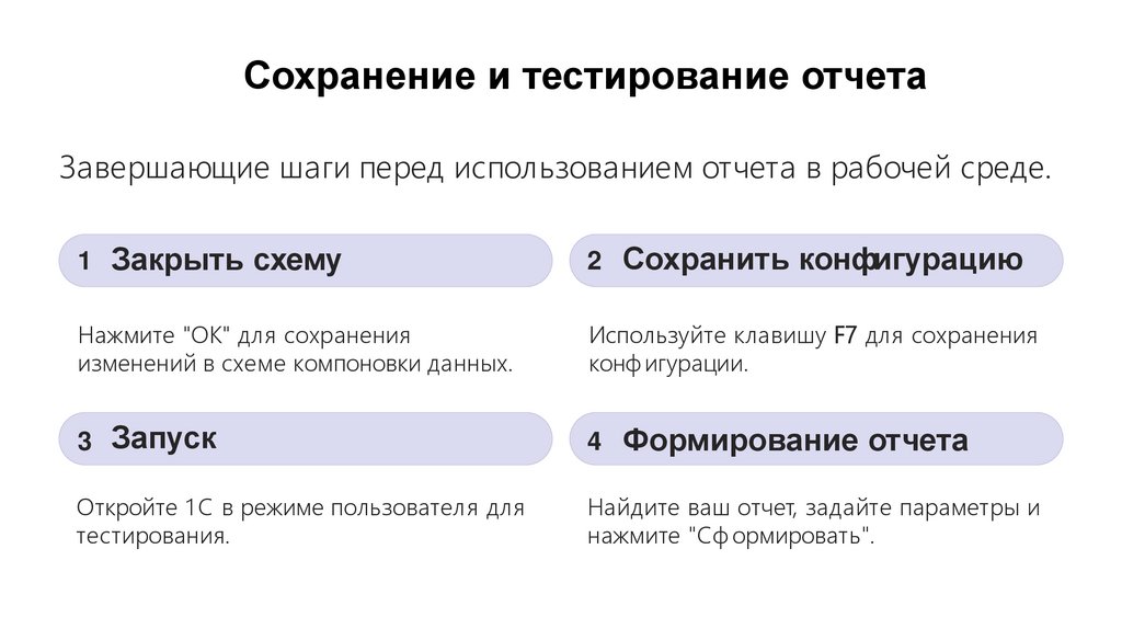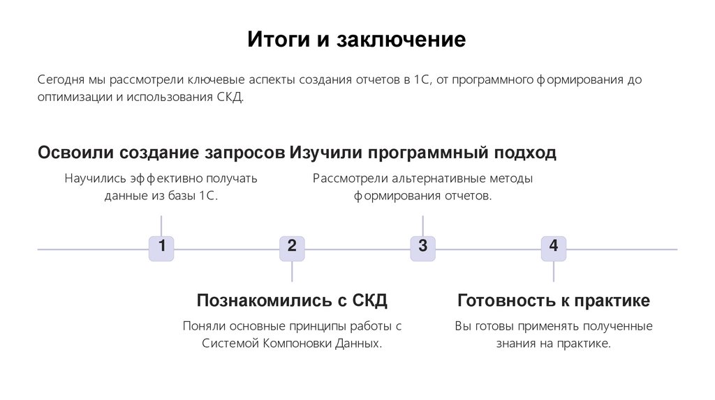 Итоги и заключениеСегодня мы рассмотрели ключевые аспекты создания отчетов в 1 С, от программного ф ормирования до