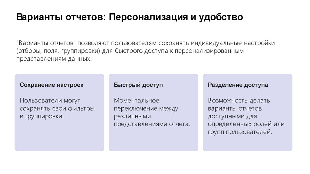 Варианты отчетов: Персонализация и удобство"Варианты отчетов" позволяют пользователям сохранять индивидуальные настройки
