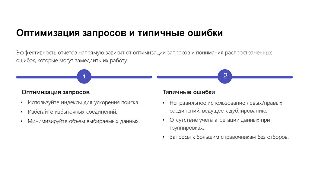 Оптимизация запросов и типичные ошибкиЭф ф ективность отчетов напрямую зависит от оптимизации запросов и понимания распространенных