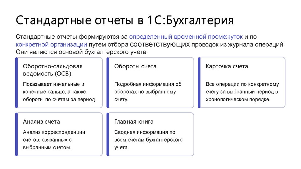 Стандартные отчеты в 1 С:БухгалтерияСтандартные отчеты формируются за определенный временной промежуток и по