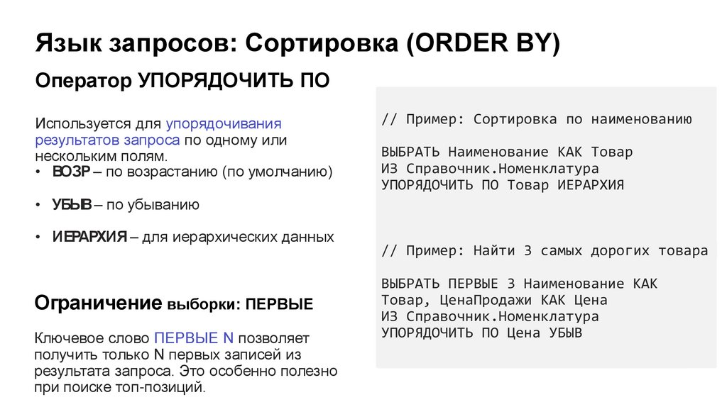 Язык запросов: Сортировка (ORDER BY)Оператор УПОРЯДОЧИТЬ ПО