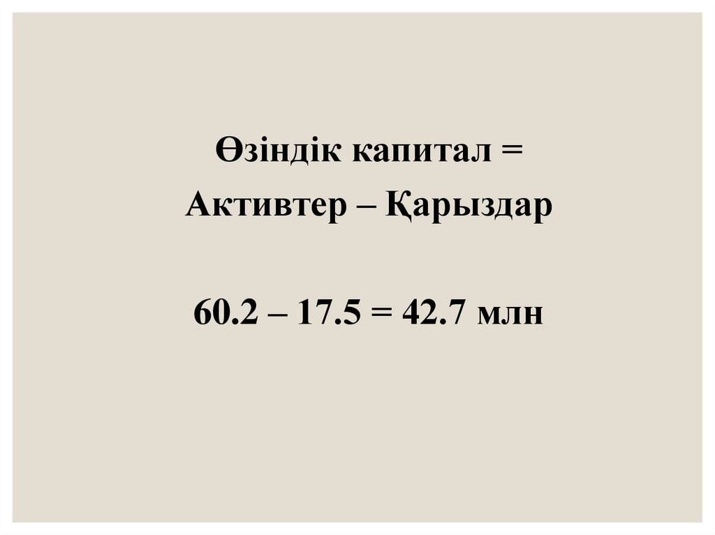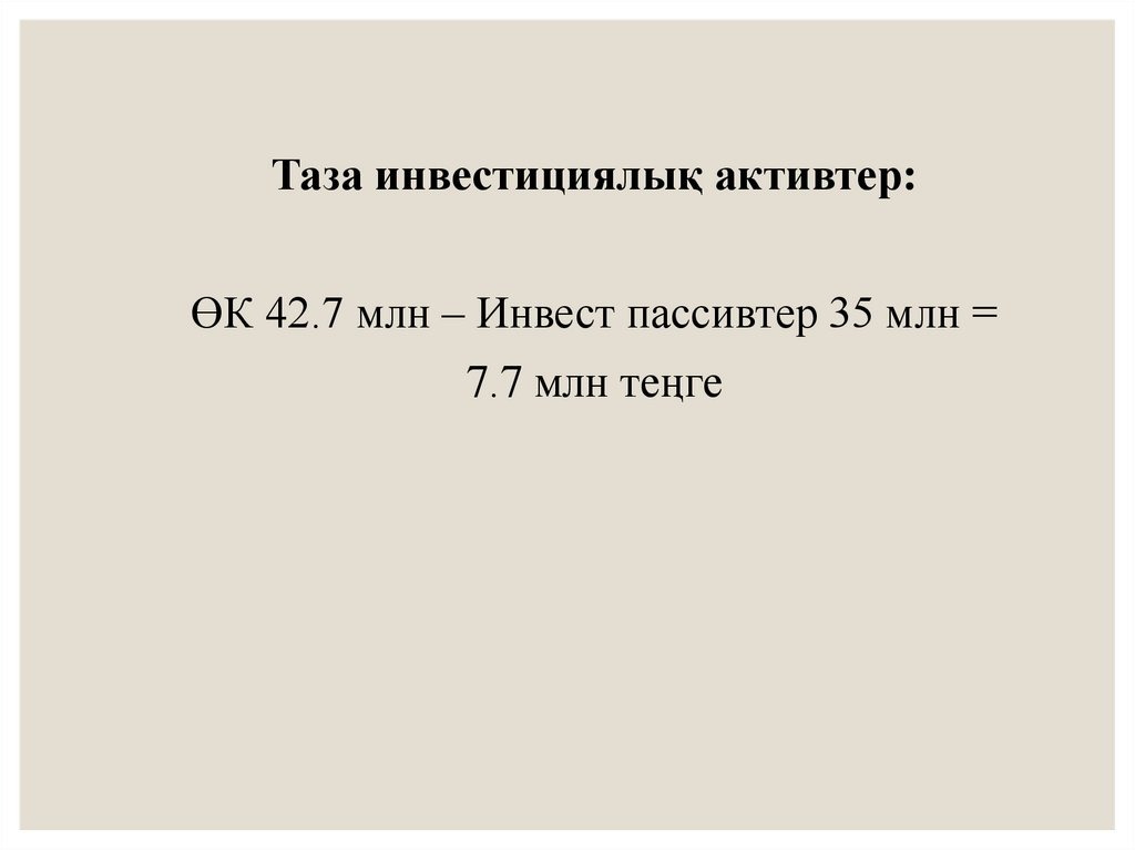 Таза инвестициялық активтер:ӨК 42.7 млн – Инвест пассивтер 35 млн =