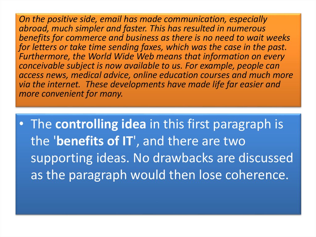 • Lets look at the first paragraph for the essay about IT.The essay is about the benefits and drawbacks of IT, so