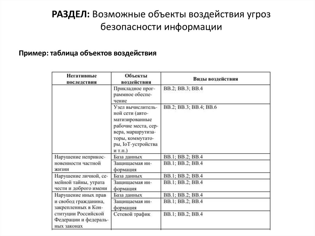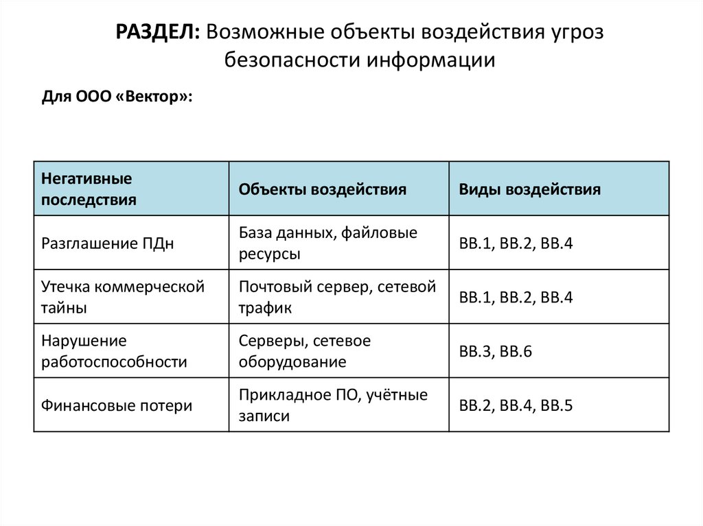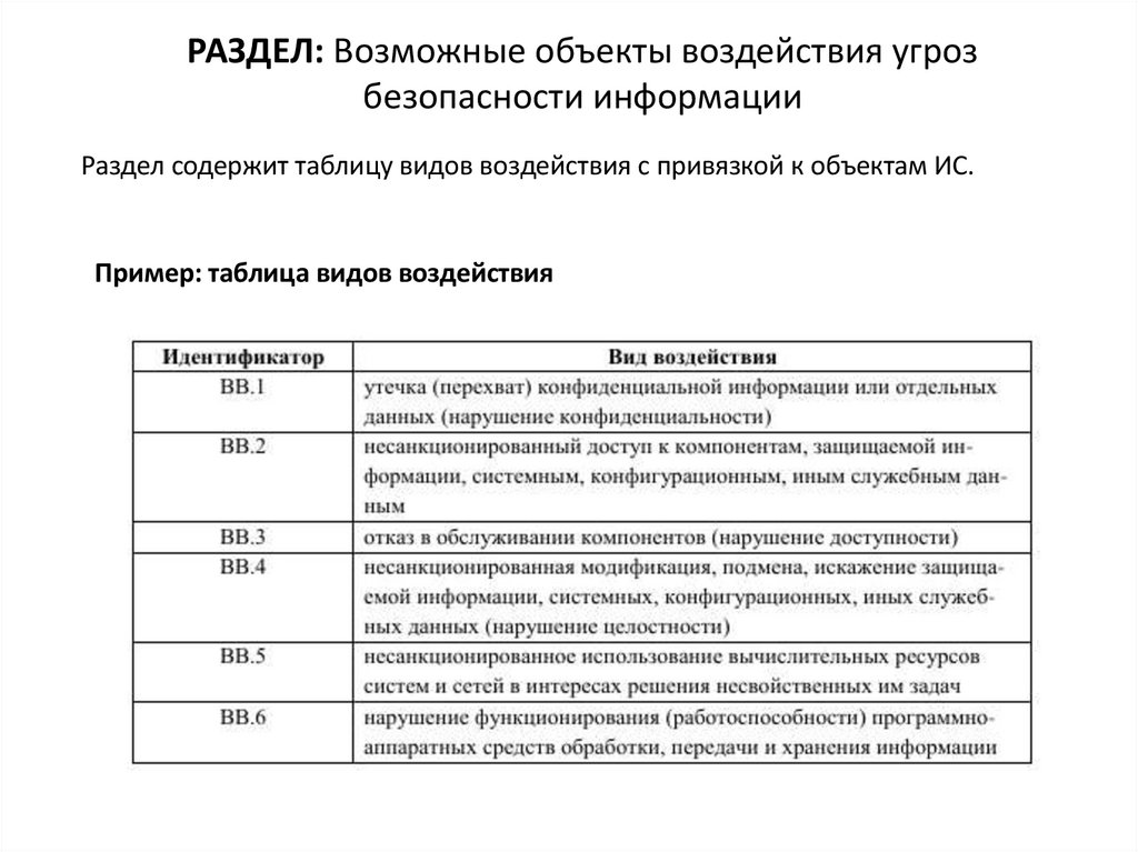 Раздел содержит таблицу видов воздействия с привязкой к объектам ИС.