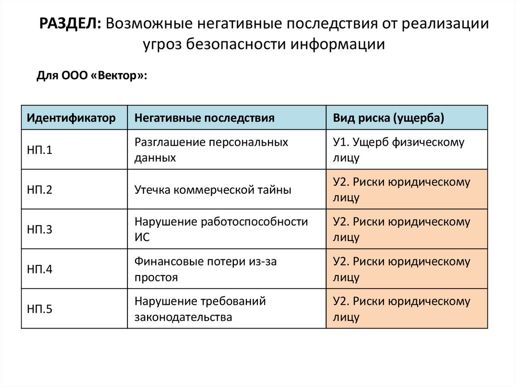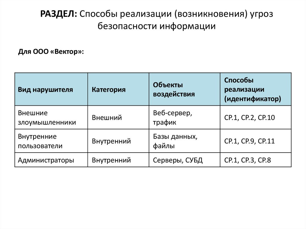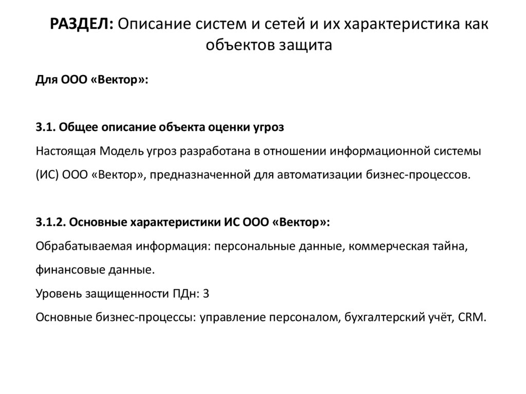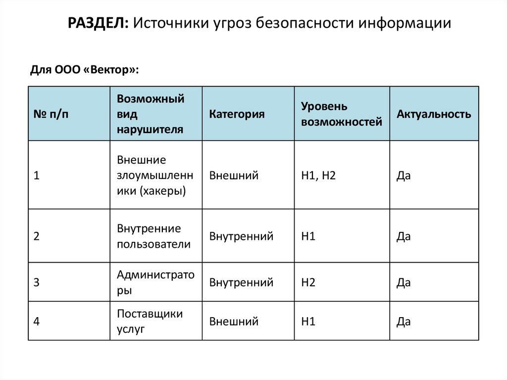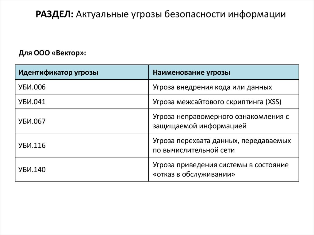 РАЗДЕЛ: Актуальные угрозы безопасности информацииДля ООО «Вектор»: