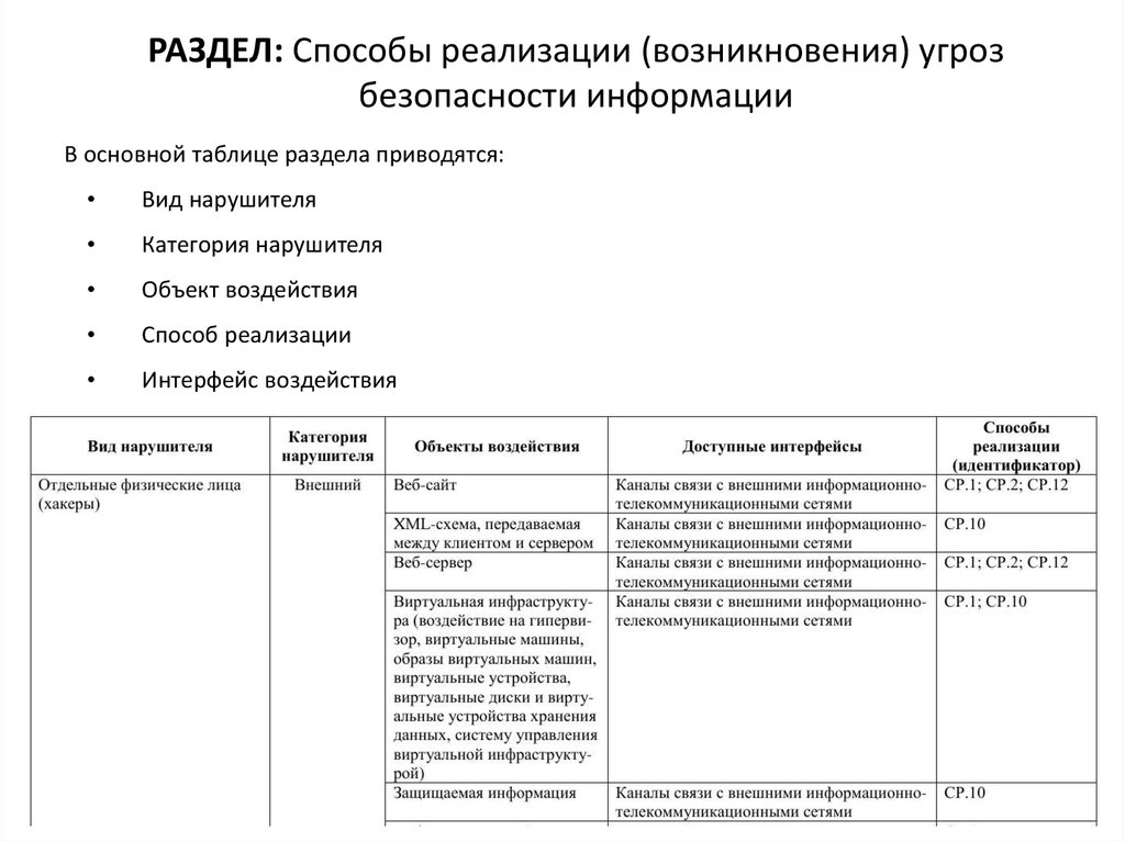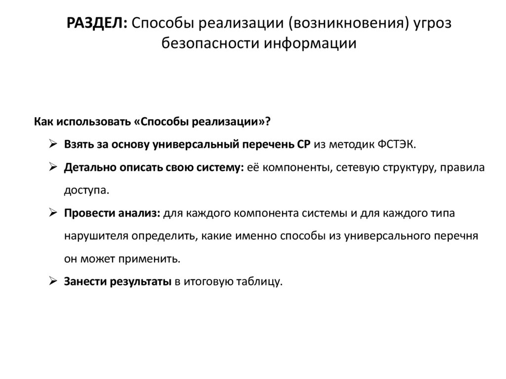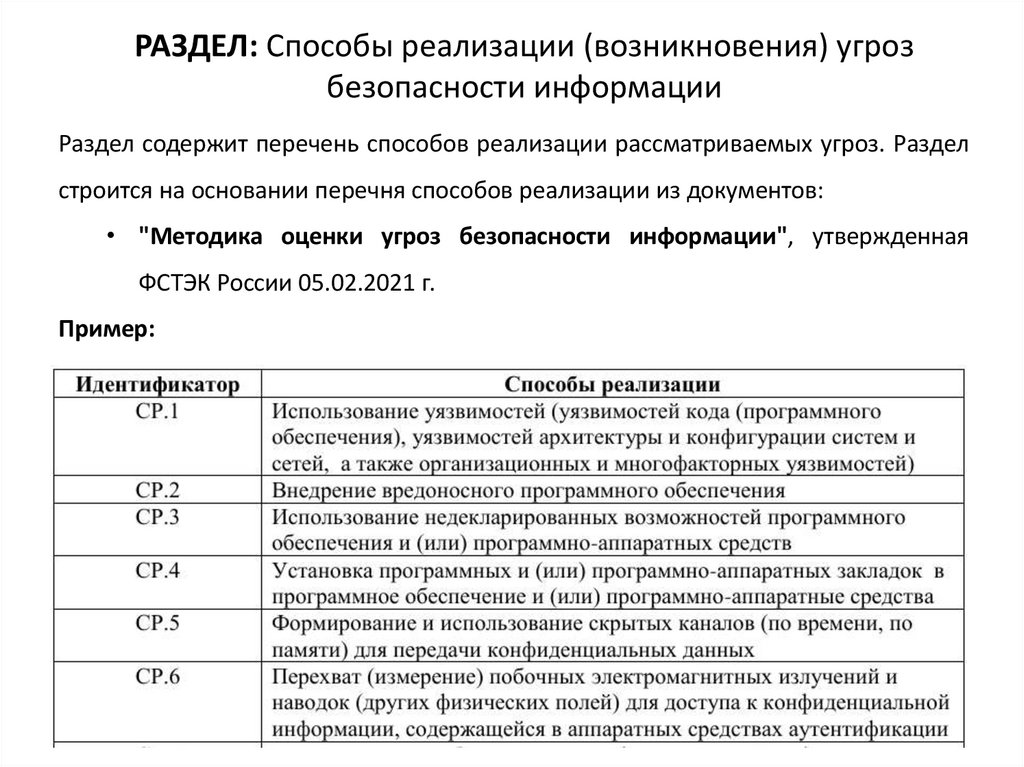 Раздел содержит перечень способов реализации рассматриваемых угроз. Раздел