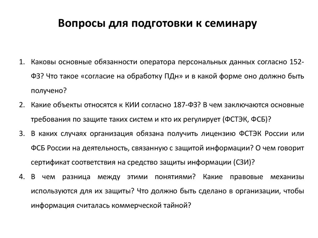 Вопросы для подготовки к семинару1. Каковы основные обязанности оператора персональных данных согласно 152ФЗ? Что такое «согласие на обработку ПДн» и в какой форме оно должно быть
