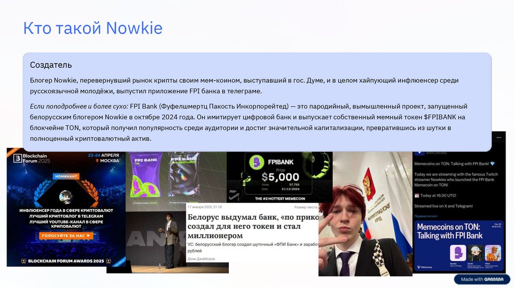 белорусским блогером Nowkie в октябре 2024 года. Он имитирует цифровой банк и выпускает собственный мемный токен $FPIBANK на