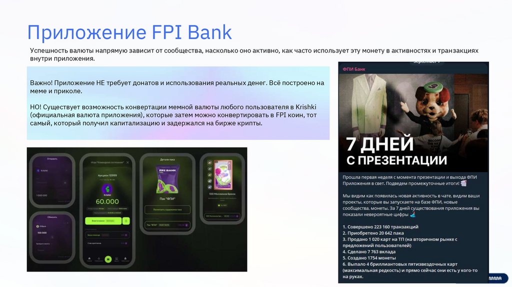 Приложение FPI BankВ этом приложении пользователи могут создавать свои монеты, обменивать их на другие, приумножать (или убавлять) свой капитал за счёт игр