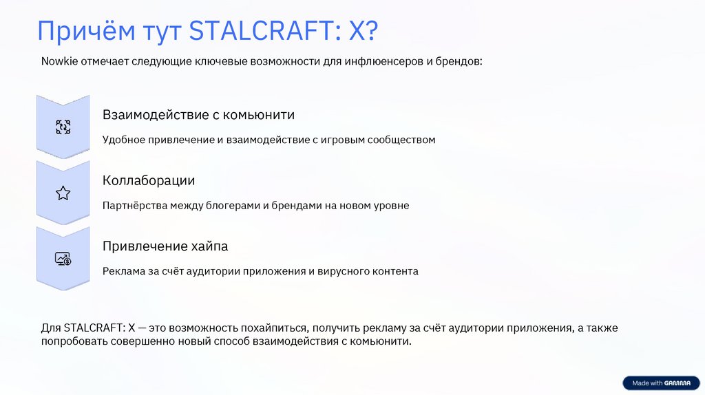 Причём тут STALCRAFT: X?Nowkie отмечает следующие ключевые возможности для инфлюенсеров и брендов: