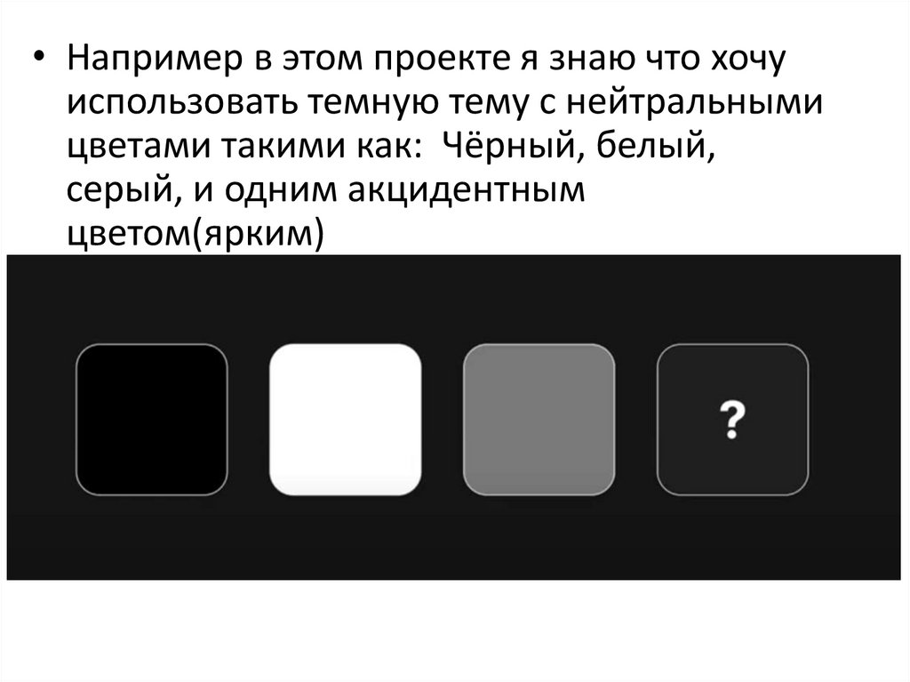 • Например в этом проекте я знаю что хочуиспользовать темную тему с нейтральными