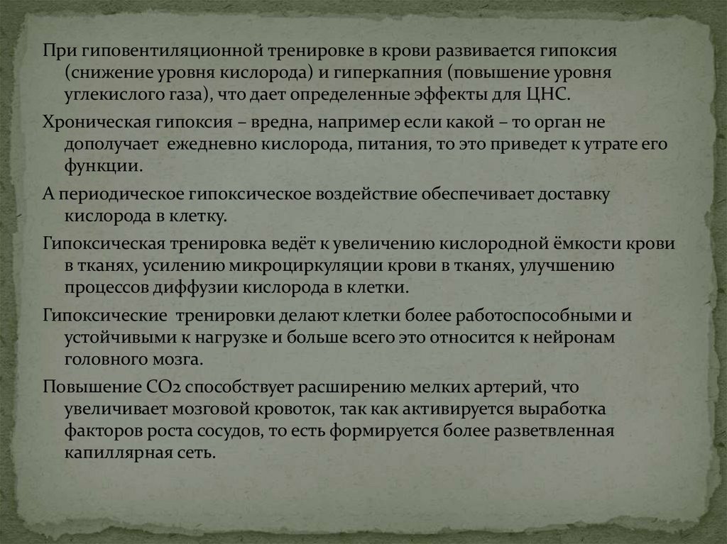 При гиповентиляционной тренировке в крови развивается гипоксия(снижение уровня кислорода) и гиперкапния (повышение уровня