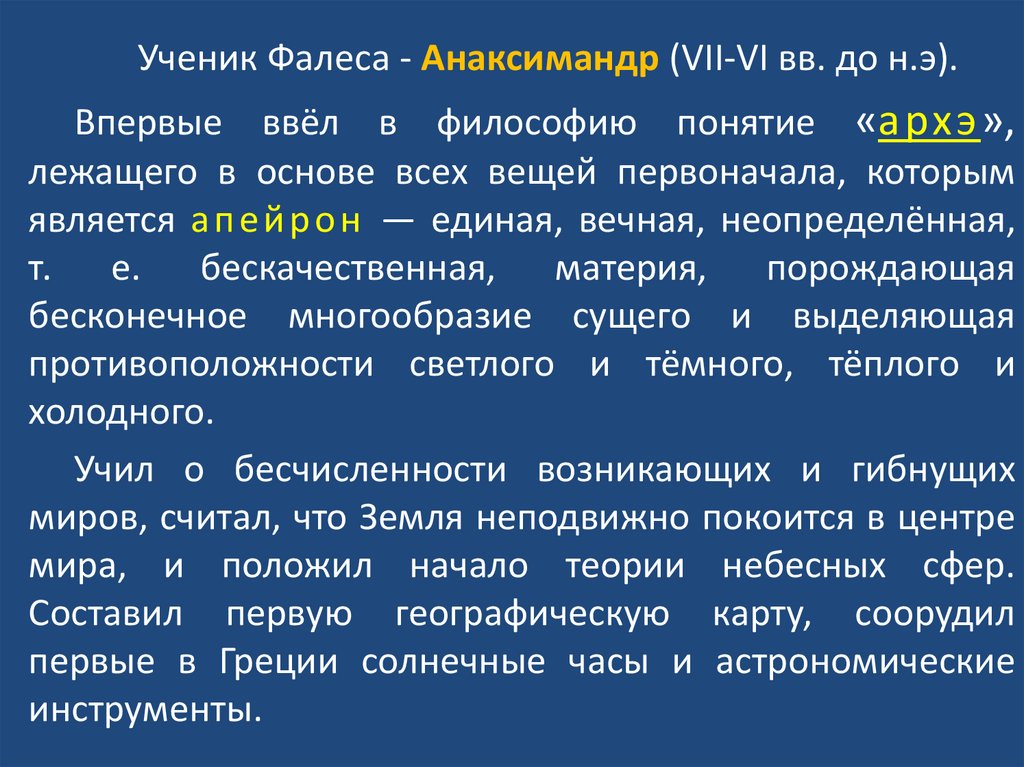 Ученик Фалеса - Анаксимандр (VII-VI вв. до н.э).Впервые ввёл в философию понятие «архэ»,