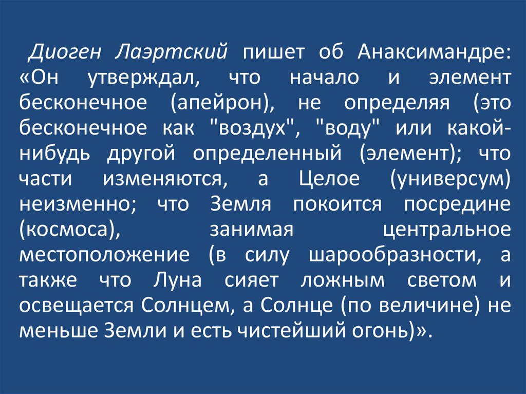 Диоген Лаэртский пишет об Анаксимандре:«Он утверждал, что начало и элемент