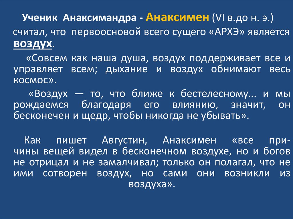 Как пишет Августин, Анаксимен «все причины вещей видел в бесконечном воздухе, но и богов