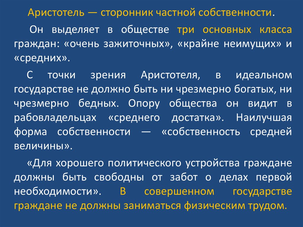 Аристотель — сторонник частной собственности.Он выделяет в обществе три основных класса