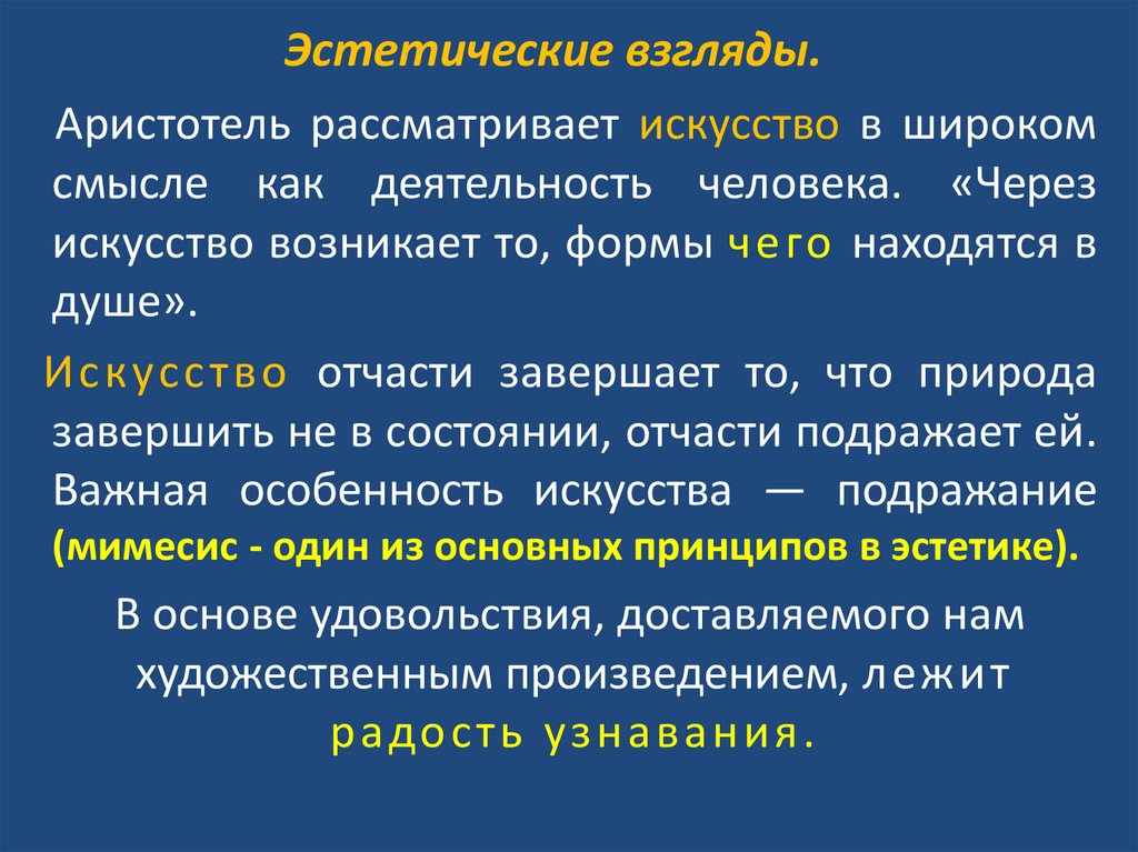 Эстетические взгляды.Аристотель рассматривает искусство в широком