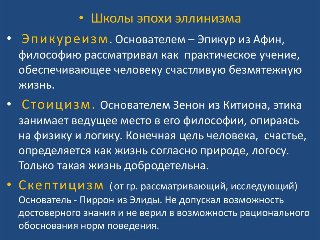 • Школы эпохи эллинизма• Эпикуреизм . Основателем – Эпикур из Афин,