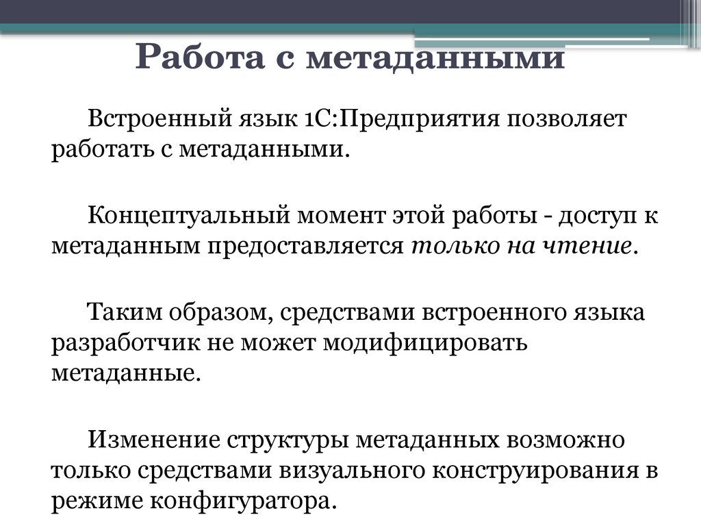 Встроенный язык 1С:Предприятия позволяетработать с метаданными.