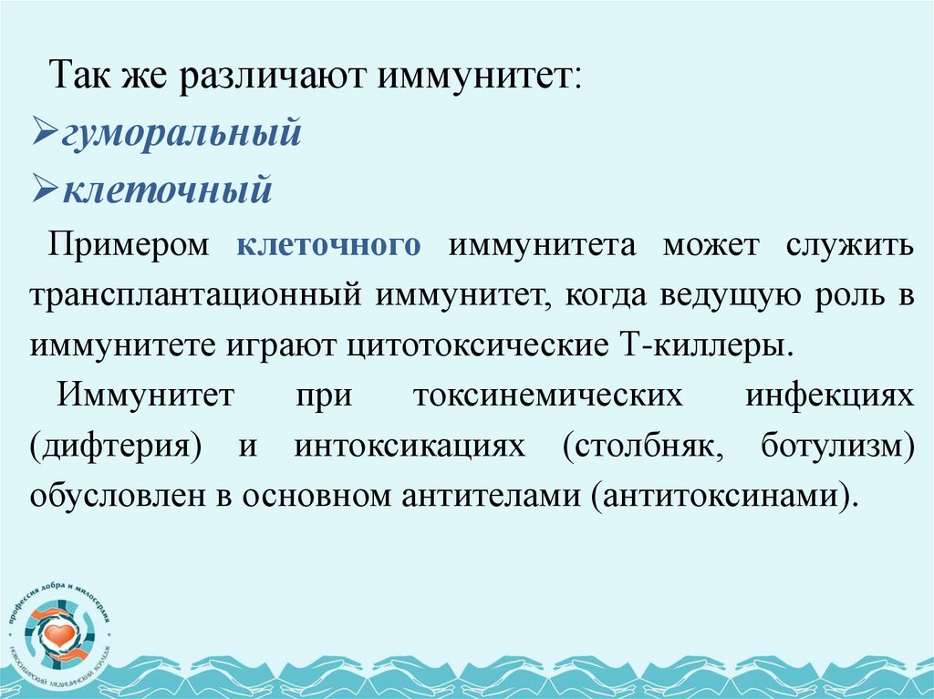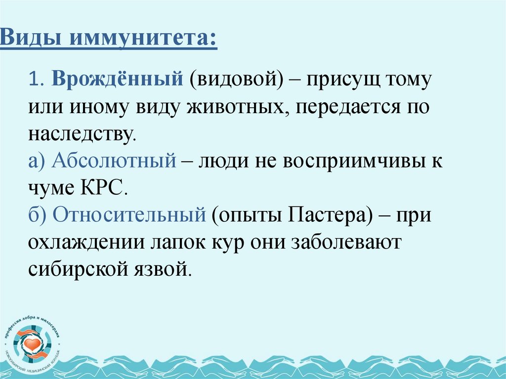 Виды иммунитета:1. Врождённый (видовой) – присущ тому